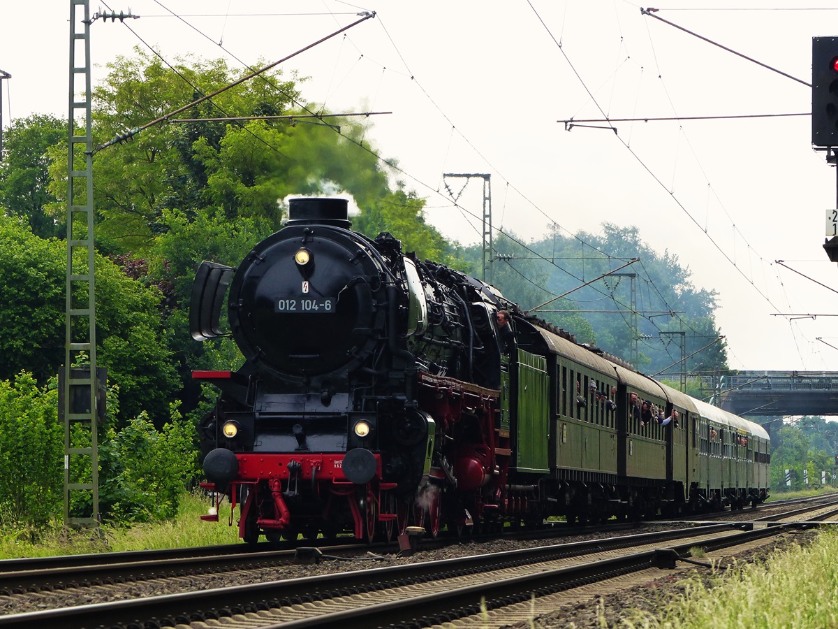 Volldampf voraus, 012 104-6 dampfte am 29.5.25 kräftig durch das Emsland in Richtung Ostfriesland, das Ziel der Rundfahrt von Rheine aus war das Zwischenahner Meer. Grade passierte die Lok das Einfahrvorsignal des Bahnhofs Lingen (Ems) Jens Hubers
