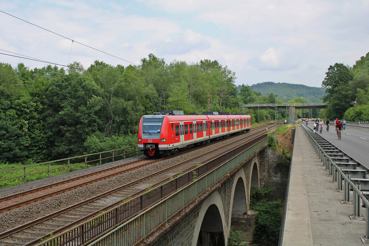 DB 423 035 überquert als S12 (Wissen(Sieg) - Horrem) die Sieg kurz nach der Abfahrt in Wissen. Anlässlich der Radveranstaltung Siegtal pur wurden einzelne Züge der Linie S12 über Au(Sieg) hinaus bis nach Wissen verlängert. (02.07.2023)