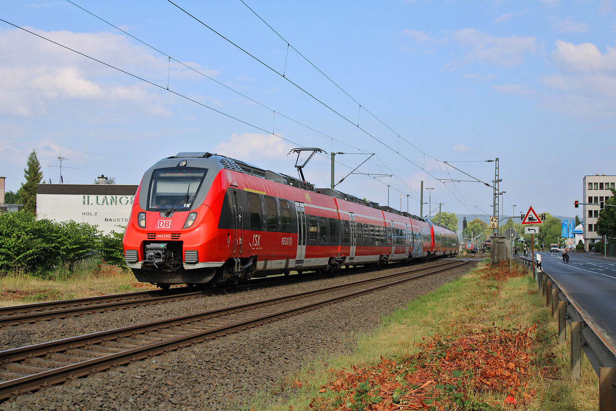 DB 442 301 rollt entlag der Graslandebahn von Etzbach als RE9 in Richtung Siegen. (02.07.2023)