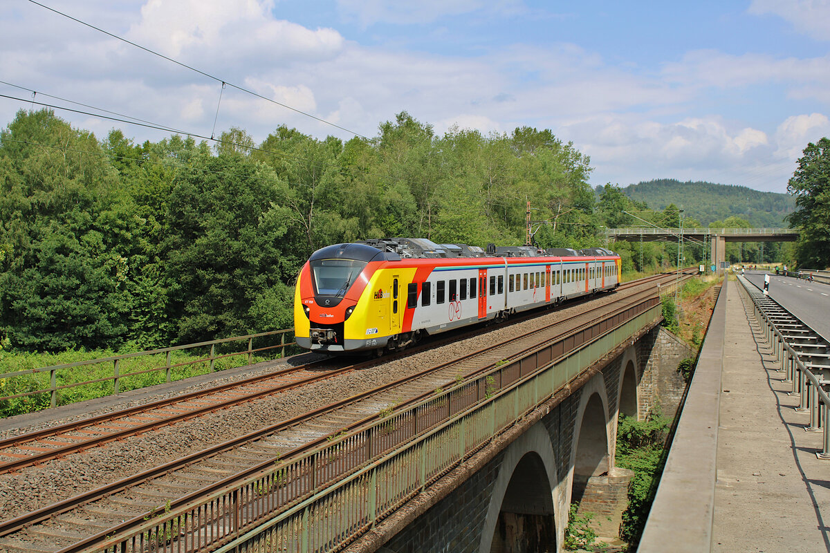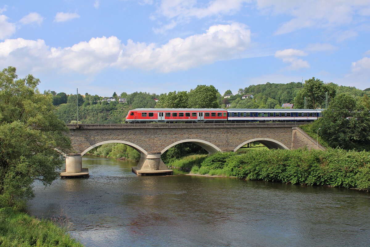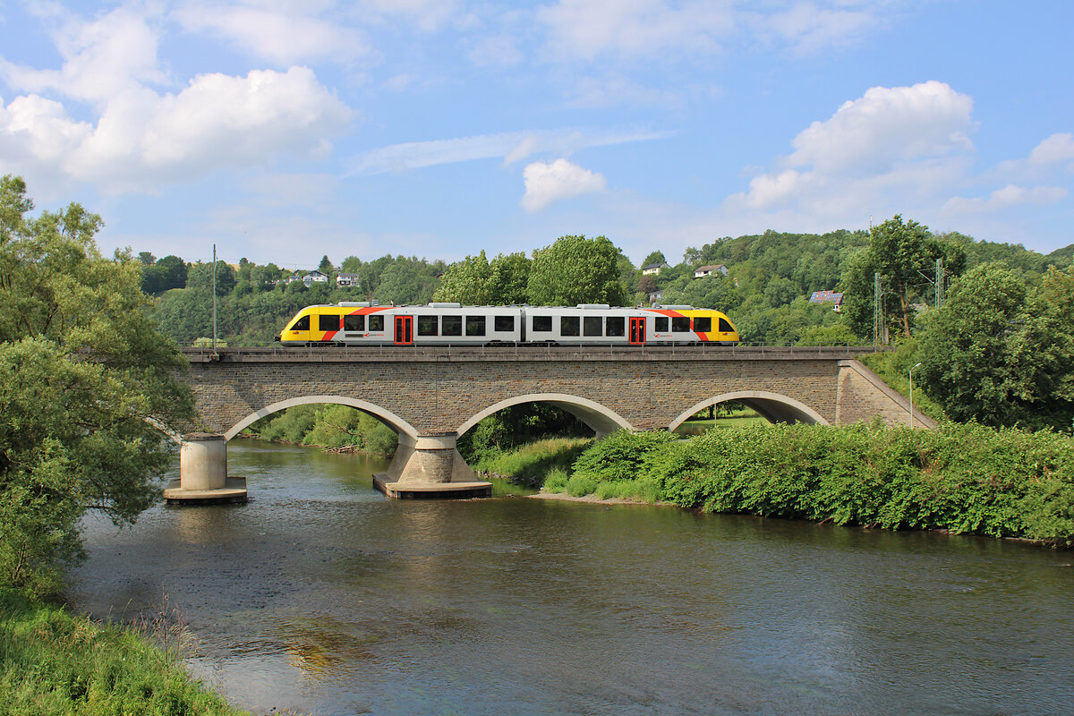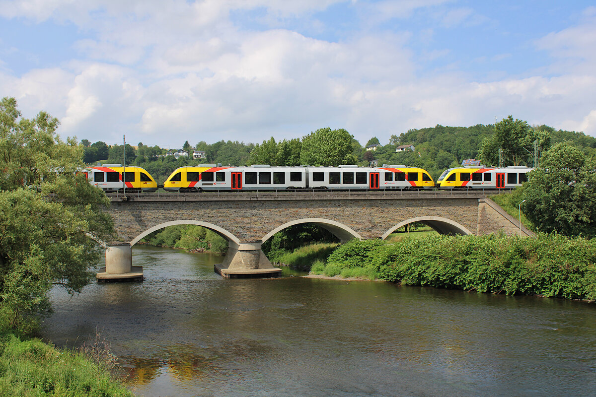 HLB 648 160, eingeklemmt zwischen 640 108 und einem weiteren 648 als Dreifachtraktion auf der RB90 von Siegen in Richtung Au(Sieg) an, überquert hier bei Etzbach die Sieg. (02.07.2023)