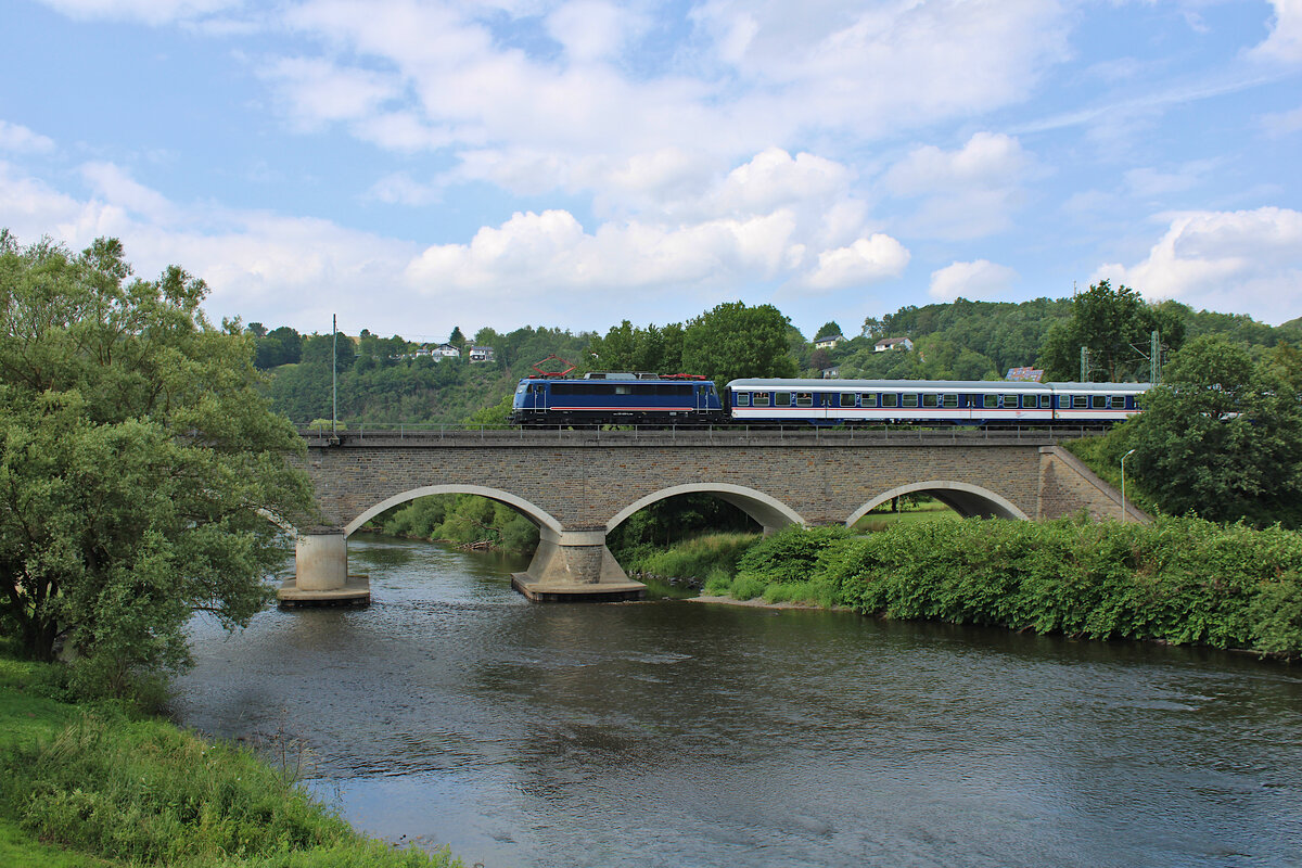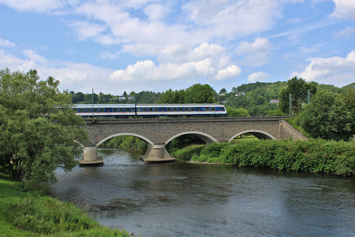 Ein TRI-Sonderzug überquert die Sieg zwischen Au(Sieg) und Etzbach als RE9 von Troisdorf nach Siegen-Weidenau, anlässlich der Radveranstaltung Siegtal pur. (02.07.2023)