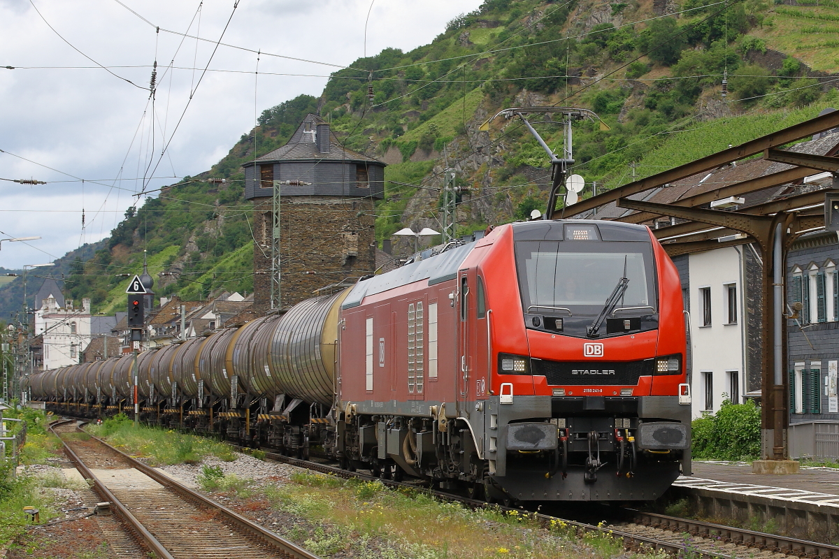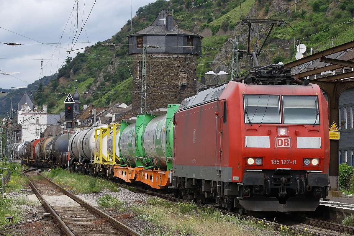 187 331 der Hlg über die BÜ - Schranke fotografiert. Hinten verschwindet noch ein ICE, der sich aufgrund einer linksrheinischen Streckensperrung rechts des Rheins von Wiesbaden nach Koblenz schlängelt. Aufnahme vom 10.05.2025, Lorch, Mittelrhein Joachim Görg