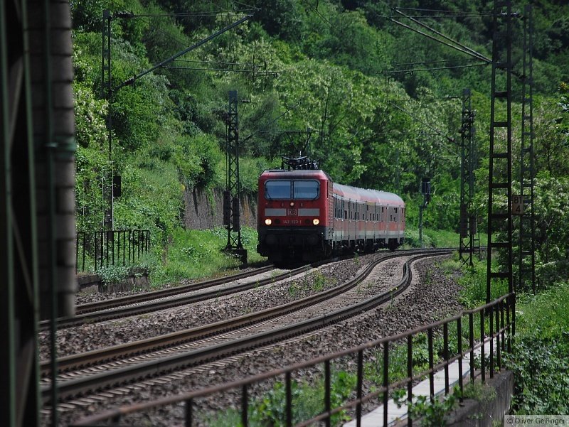 143 923-1 mit RB 15528 Wiesbaden–Koblenz auf der rechten Rheinseite kurz vor Kaub. (19. Mai 2009)