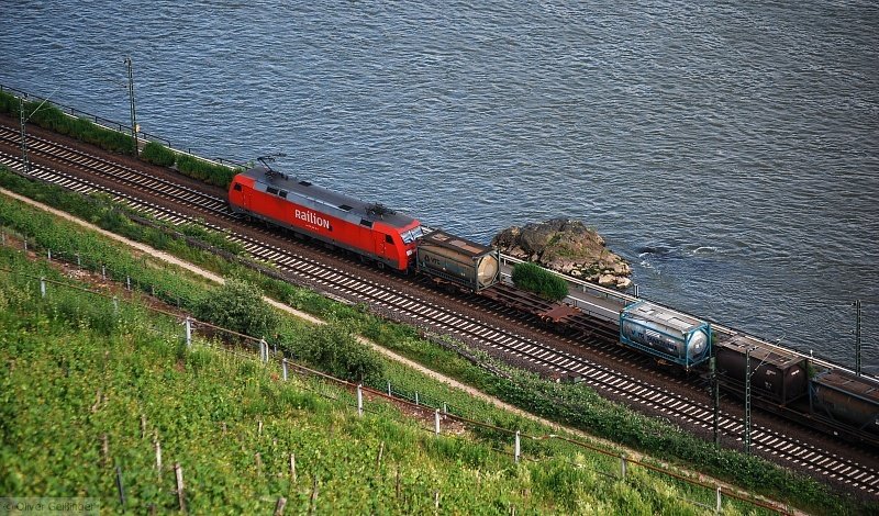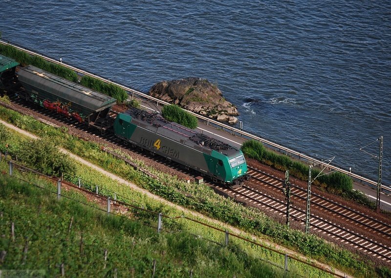 Hauptbahnromantik (Mittelrheintal). An der  Costa Rhenania  entlang fährt 185 55x-1 der R4C mit einem Güterzug kurz nach Rüdesheim in Richtung Koblenz. (12. Juni 2009)