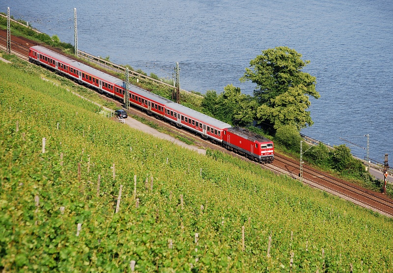 Hauptbahnromantik (Mittelrheintal). An der  Costa Rhenania  entlang fährt RB 15426 nach Koblenz mit einer 143 aus dem Bahnhof Rüdesheim aus. (12. Juni 2009) Muss doch dem Stefan mit seinen Weinbergküstenbildern auch mal Konkurrenz machen...