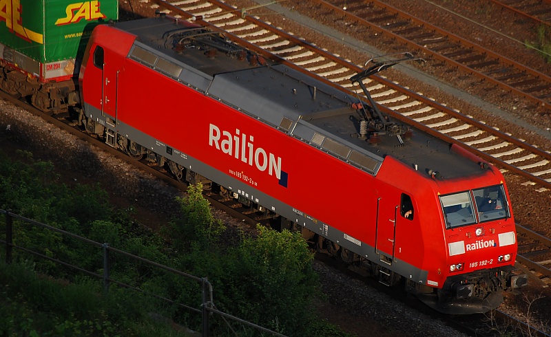 Hauptbahnromantik (Mittelrheintal). Blick aus den Rüdesheimer Weinbergen auf 185 192-2 mit nur 2 Stromabnehmern bei der Durchfahrt durch den Bahnhof Rüdesheim richtung Koblenz. (12. Juni 2009)