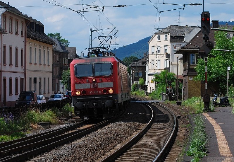 Hauptbahnromantik (Mittelrheintal). RB 15533 mit 143 198-0 zwängt sich durchs dicht gedrängte Assmannshausen. (12. Juni 2009)