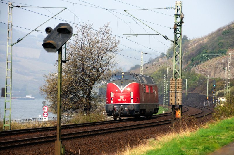 Keine Chance hat das Rheinfrachtschiff bei diesem ungleichen Wettrennen... 221 117-5 läßt es einfach hinter sich. (Kurz nach Kaub, April 2009). Helmut Dimitroff