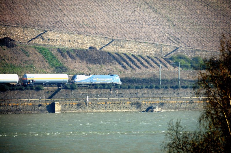 Blick von der Bahnhofsüberführung in Bingen am Rhein auf den Mäuseturm und auf der rechten Rheinseite, auf Burg Ehrenfels. Dazwischen, auf der KBS 466, einer der beiden MWB-Tauri, unterwegs mit einem Kesselwagenzug, Richtung Rüdesheim am Rhein. (April 2009). Helmut Dimitroff