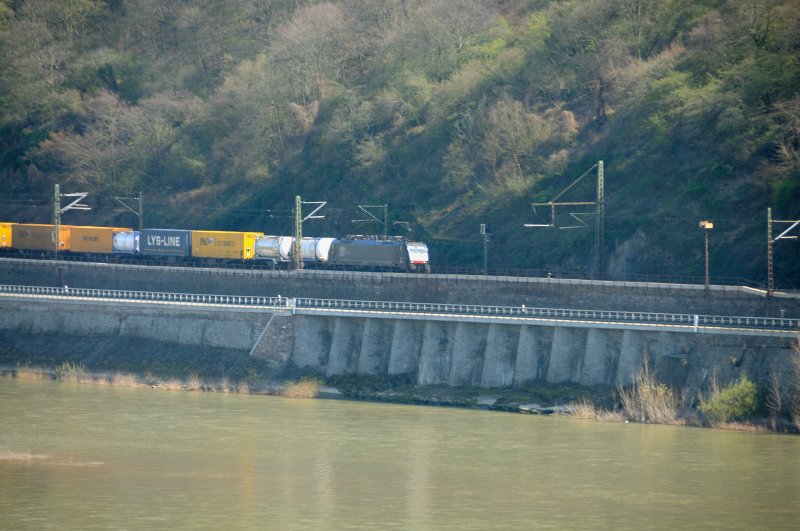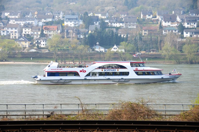 Beide Rheinstrecken im Blick: Unten die KBS 471 und auf de anderen Rheinseite die KBS 466. Links sieht man noch die sogenannnte Rhein-Galerie der KBS 466. (Aufgenommen aus den Weinbergen nach Oberwesel, April 2009). Helmut Dimitroff