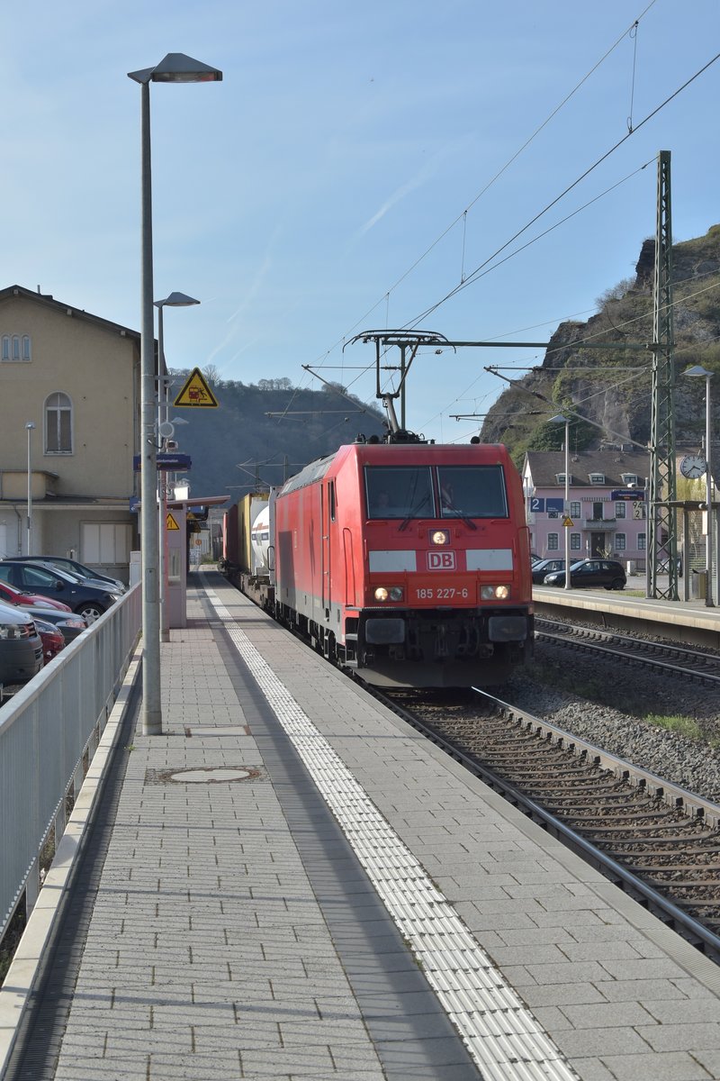 DB Schenker Rail Scandinavia 185 321 schleppt einen gemischten Güterzug am 29.04.17 auf der rechten Rheinstrecke bei Kestert in Richtung Wiesbaden. Reinhard Kühn