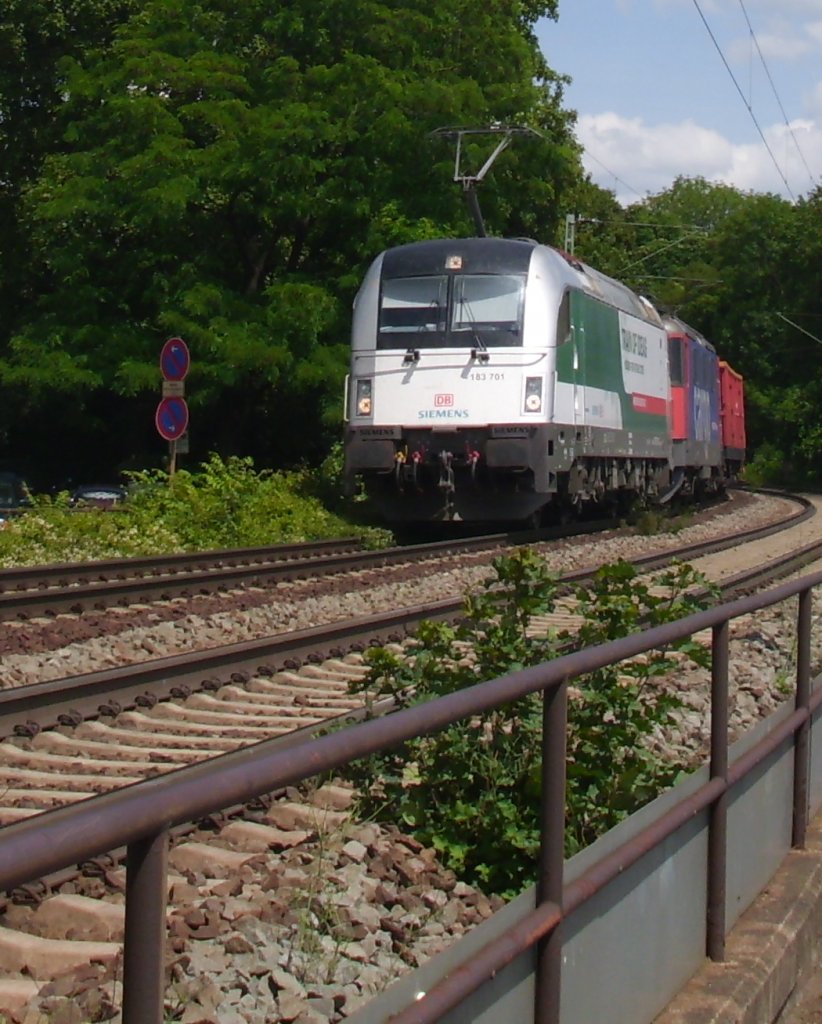 Immer wieder sonntags: MEG fährt den Zementzug von Oberhausen West Richtung Bayern. Am Morgen des 14.7. übernahmen eine 143 mit 155 die Leistung und werden in Kürze durch die Ortschaft Assmannshausen fahren