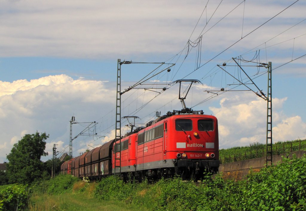 Railion 151 142-7 + RAILION DB Logistics 151 032-0 mit Kohlewagen Richtung Wiesbaden, am 07.07.2012 bei Hattenheim.