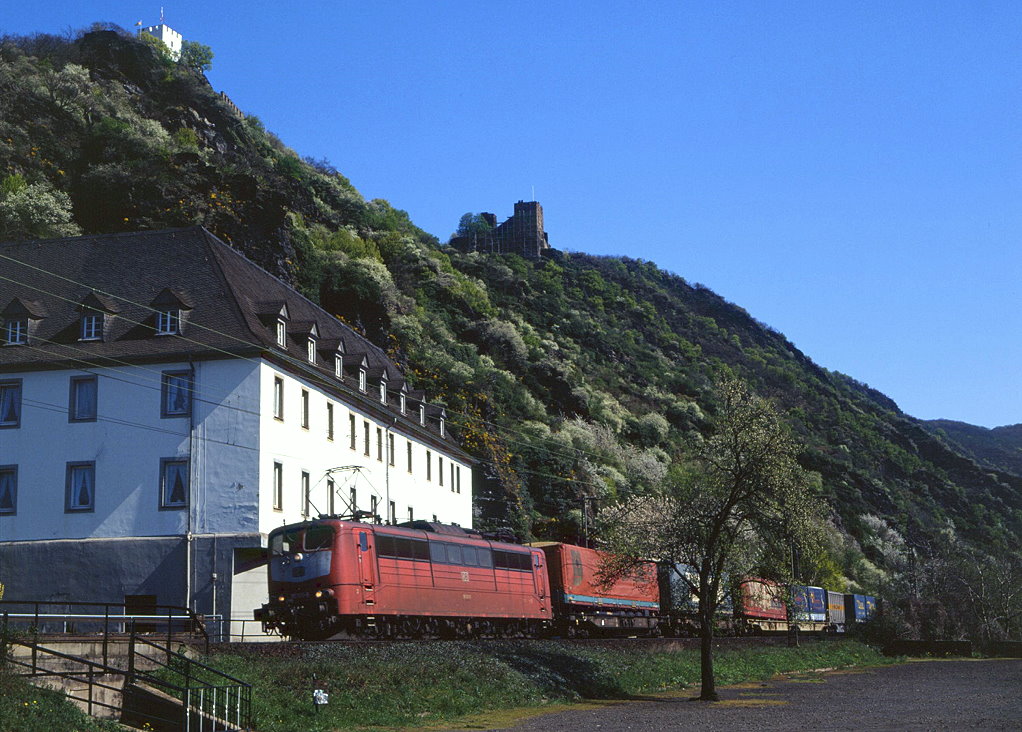 - Güterzüge à gogo - Vor der Kulisse der Burg Gutenfels durchfährt die 155 111-8 mit einem Containerzug am Haken den Bahnhof von Kaub. 25.06.2011 (Jeanny) De Rond Hans und Jeanny
