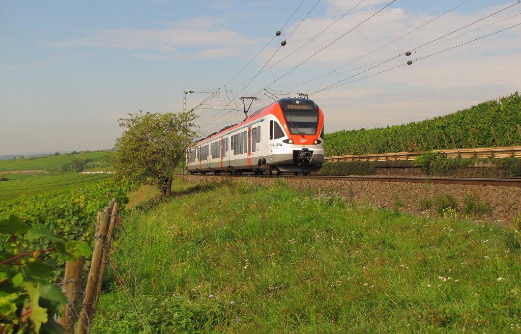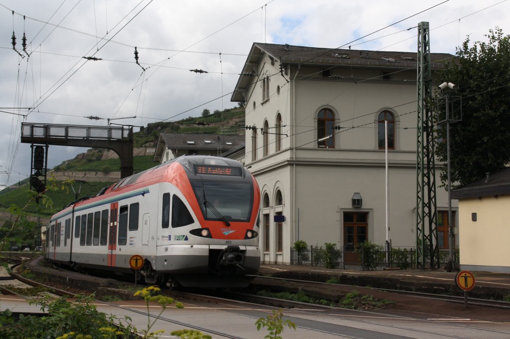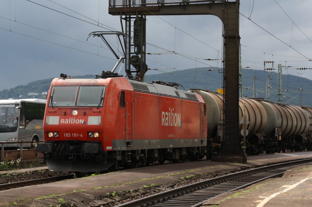 - UNESCO Welterbe Oberes Mittelrheintal - Bei mässigem Wetter durchfährt ein Güterzug den Bahnhof von Kaub, vorbei an der Burg Gutenfels, welche auf einem Felssporn 110 Meter über der Stadt steht. Bei der Burg handelt es sich um eine guterhaltene Frontturmburg mit 35 Meter hohem quadratischen Bergfried und einem etwa 22 mal 8 Meter großen dreigeschossigen Wohnbau. Die etwa 21,60 mal 21,10 Meter große Kernburg war durch die Vorburg, eine Zwingeranlage und eine Ringmauer geschützt. 25.06.2011 (Jeanny) De Rond Hans und Jeanny