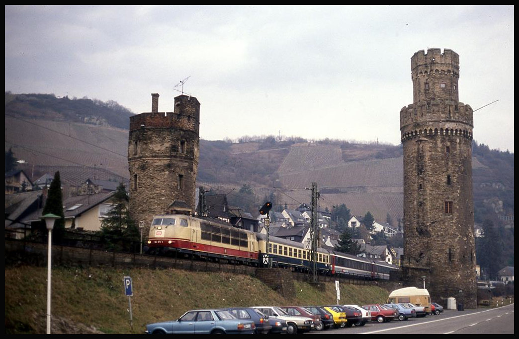 103173 ist hier mit einem EC in die Schweiz unterwegs und passiert am 10.3.1993 um 12.18 Uhr den bekannten Turm in Oberwesel.