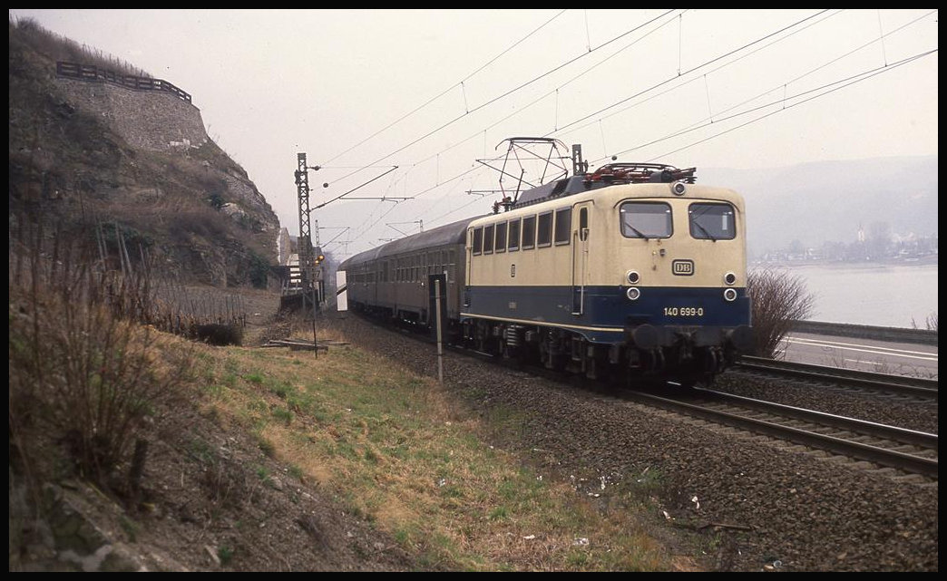 140699 ist hier am 10.3.1993 um 11.19 Uhr linksrheinisch mit einem Nahverkehrszug nach Ludwigshafen nahe Boppard unterwegs.