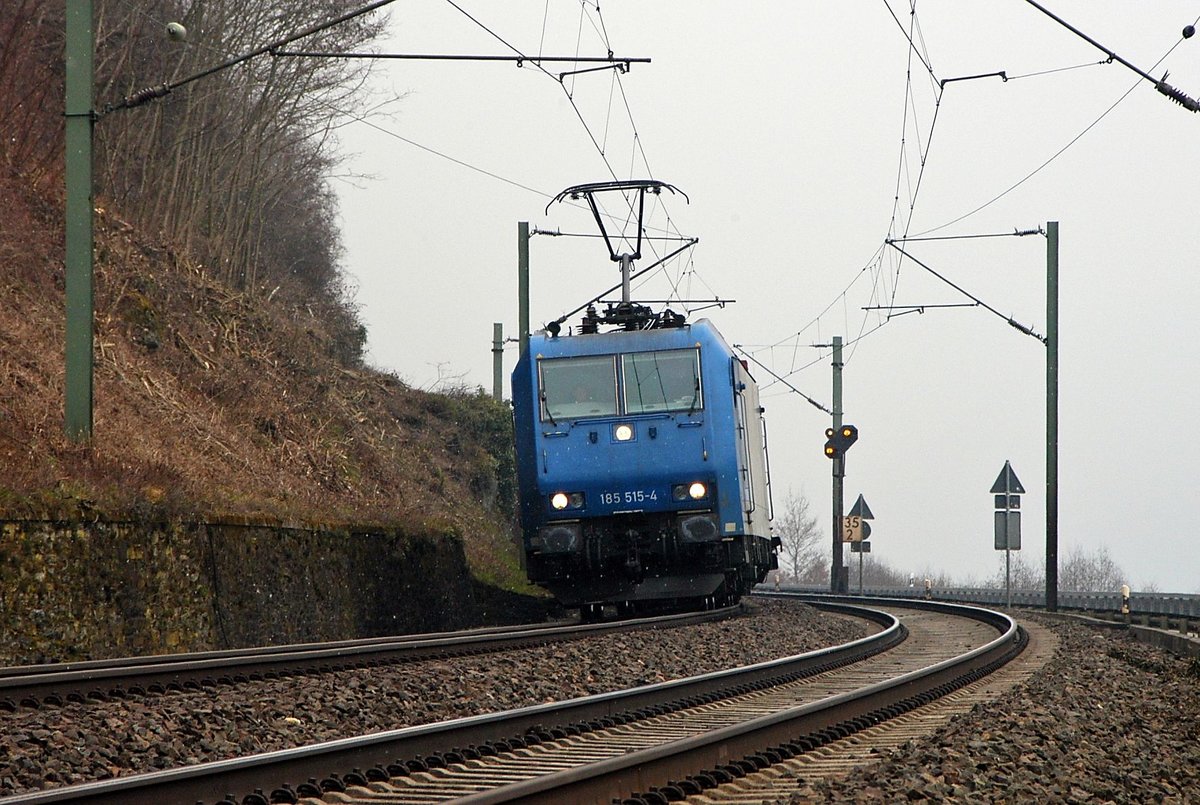 Alpha Trains Belgium 185 515, vermietet an Railtraxx, mit einem KLV-Zug im Schlepp ist bei leichtem Schneefall zwischen Oberwesel und Bacharach am 29.03.13 in Richtung Bingen unterwegs.