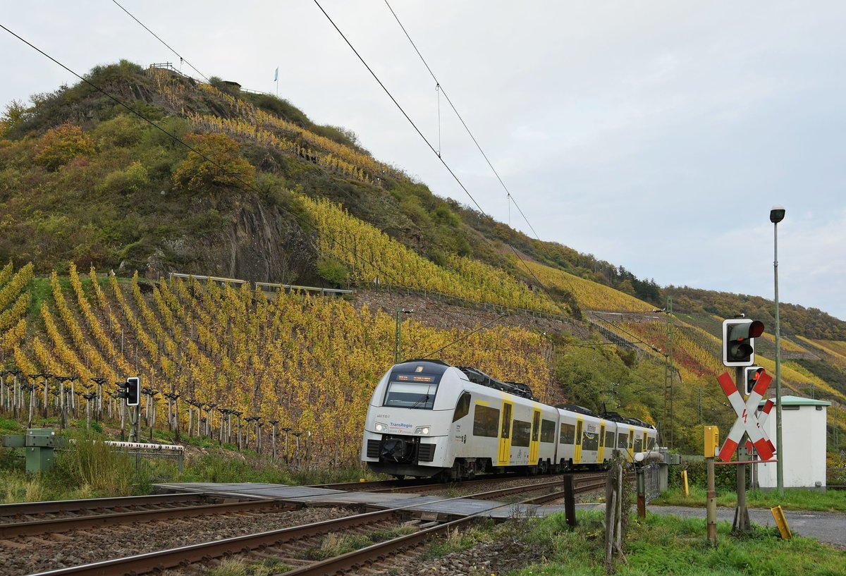 Alpha Trains Europa 460 005/505, vermietet an Transregio, ist als RB 26 (25428) "Mittelrheinbahn" Mainz Hbf - Roisdorf am 31.10.17 am Bopparder Hamm zwischen Boppard und Spay unterwegs.