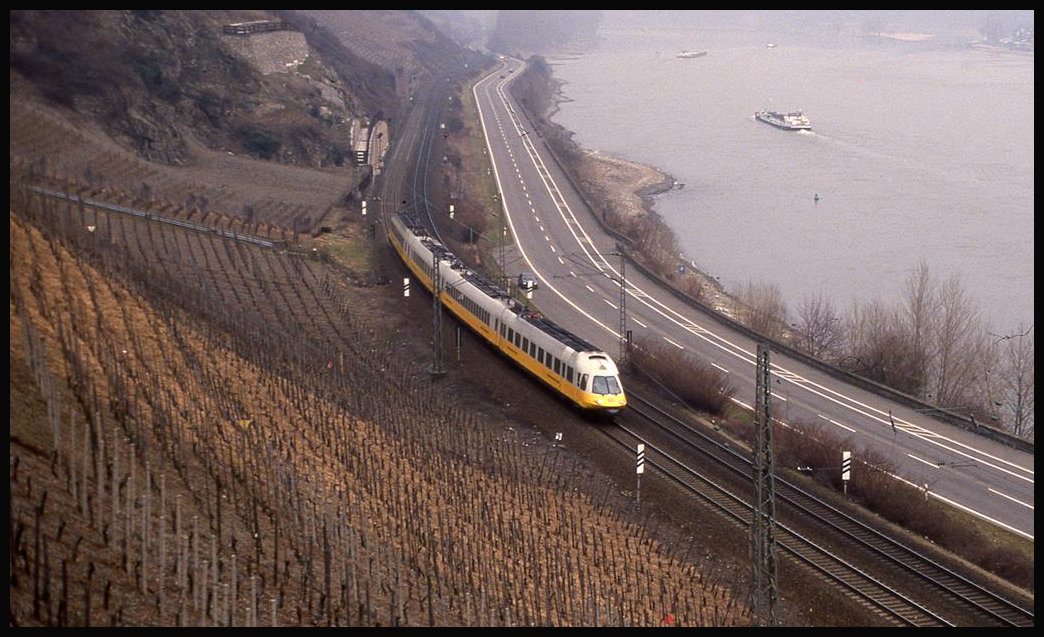 Im Rheintal bei Boppard "fliegt hier die Lufthansa ganz tief vorbei". - Flug LH 1003 ist hier am 10.3.1993 um 11.13 Uhr auf der Schiene in Richtung Frankfurt am Main unterwegs.