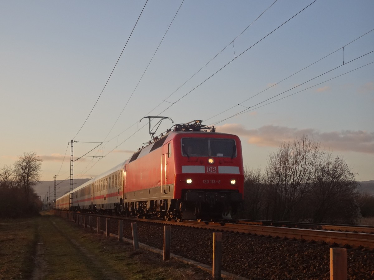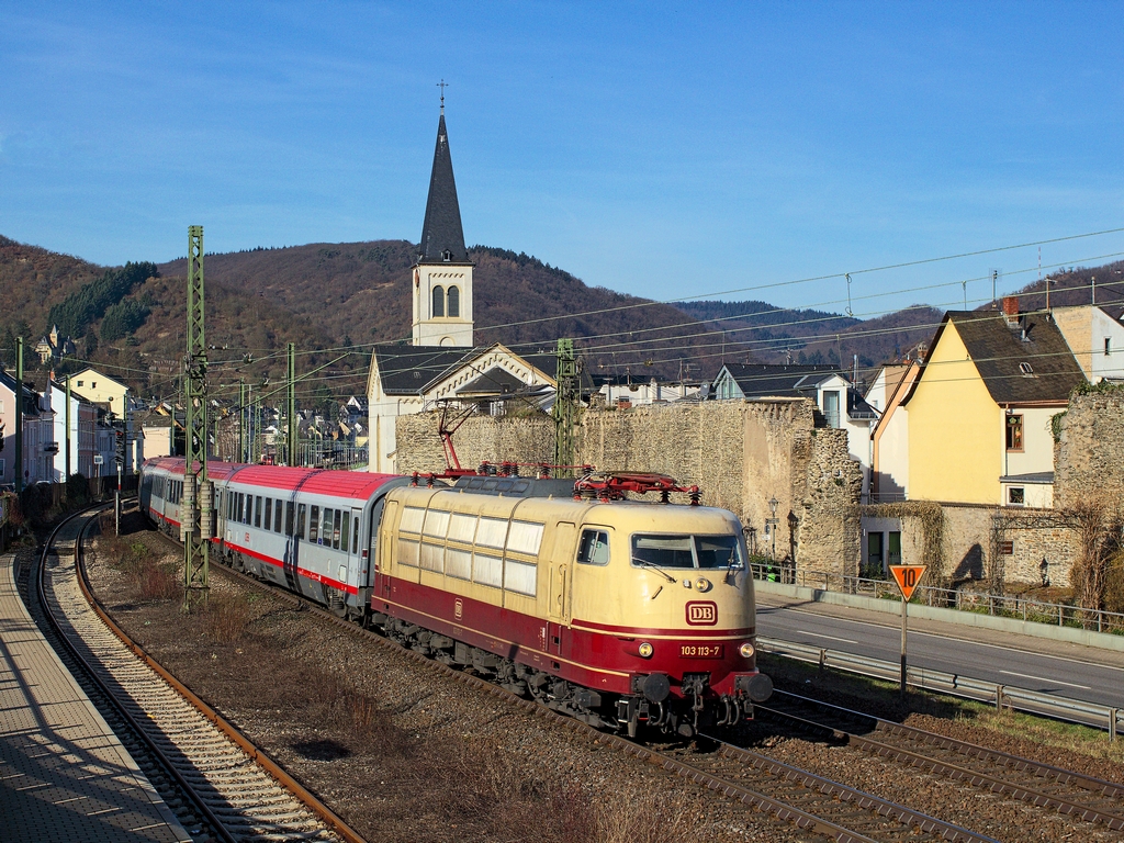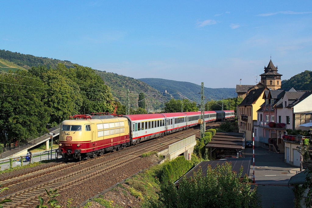 Immer ein Risiko ist es, von der einen Rheinseite auf die andere herüber zu fotografieren, so kann doch schnell mal ein Schiff im Weg sein. 103 235 mit dem IC 119 gewann jedoch am 22.7.2013 das Wettrennen und hat in Kürze Boppard-Hirzenach im Blick Markus Ü.