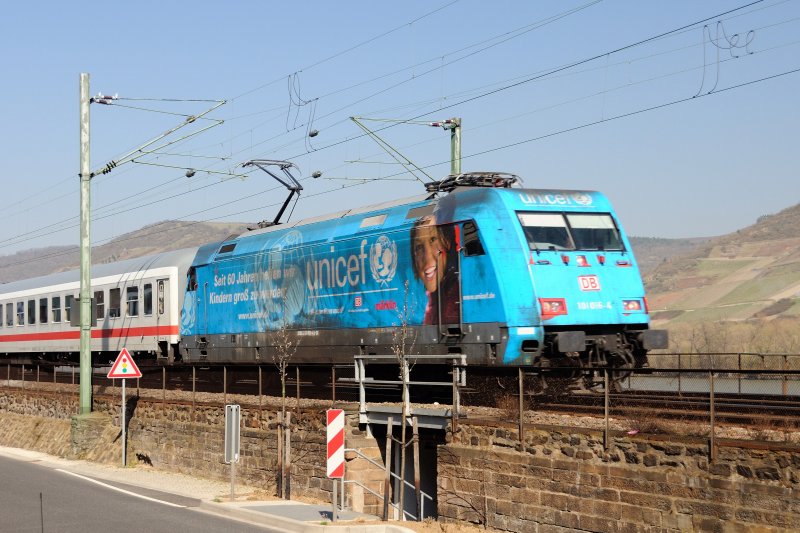 Nachtrag: Auch kurz vor Niederheimbach verläuft die Trasse der KBS 471 auf einem eigens höher angelegten Bahnkörper in Form einer gemauerten "Kaimauer" als Schutz vor Rheinhochwasser, welches der Stadt, der ufernah gelegenen Straße, sowie der Strecke gefährlich werden könnte. Als Überraschungsgast passierte an diesem Freitag die Unicef-101 die linke Rheinstrecke. (April 2009).