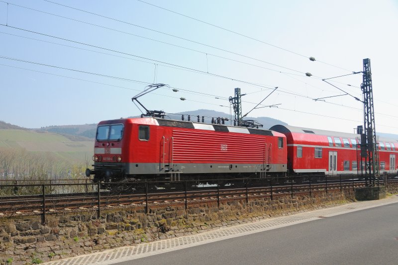 Auf nach Oberwesel. 143 568-4 verläßt mit einem Dosto-RE Bacharach, einzigste Regional-Leistung der DB auf der linken Rheinstrecke. (April 2009).