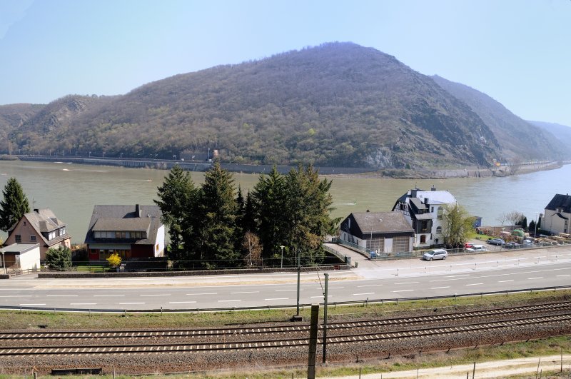 Beide Rheinstrecken im Blick: Unten die KBS 471 und auf de anderen Rheinseite die KBS 466. Links sieht man noch die sogenannnte Rhein-Galerie der KBS 466. (Aufgenommen aus den Weinbergen nach Oberwesel, April 2009).