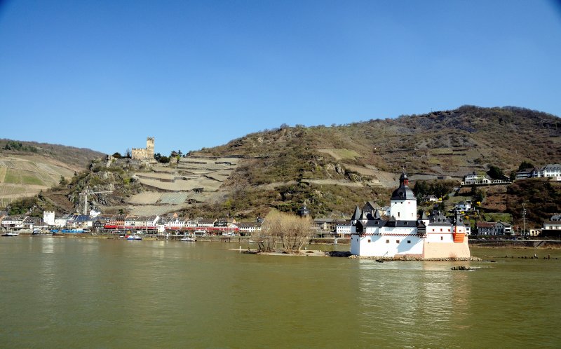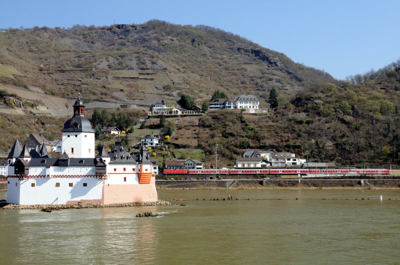 Bis 1866 diente der Pfalzgrafenstein bei Kaub als Zollstation. Er wurde 1327 von Ludwig, dem Bayern mitten im Rhein auf einer Insel errichtet. Der Winter 1813/14 rückte die Burg ins Zentrum europäischer Geschichte. Dem preußischen Generalfeldmarschall Blücher gelang hier mit seinem Heer der Rheinübergang, welcher den Sturz Napoleons einleitete. Gleich passiert eine Regionalbahn die historische Stätte. (Blick von der Autofähr-Anlegestelle Kaub auf der linken Rheinseite, April 2009).