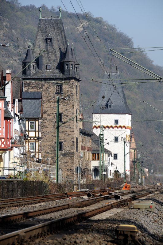 Den Abschluß der Altstadthäuser bilden zwei alte, ehemalige Wehrtürme. Direkt davor verläuft mitten durch Bacharach die KBS 471. (Aufgenommen im April 2009).