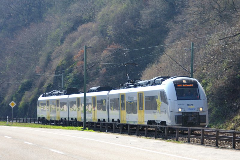 Den linksrheinischen Regionalverkehr mit Bedienung sämtlicher Regionalhalte der DB hat seit Dezember 2008 die "EuRailCo" Trans Regio (Deutsche Regionalbahn GmbH) übernommen. Sie setzt bis jetzt als einzigstes, deutsches Privat-EVU die Baureihe 460 ein, hier 460 011-0 unterwegs Richtung Koblenz. (April 2009).
