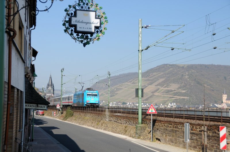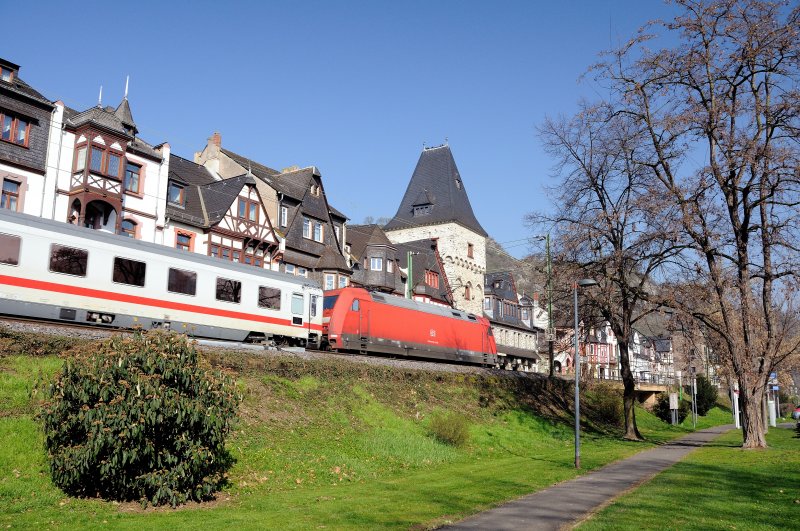 Der Intercity im Stadtpark. So gesehen in der wunderschönen Stadt Bacharach. Direkt an der Häuserzeile der Altstadt zieht eine 101 ihren Zug gen Koblenz. (April 09).