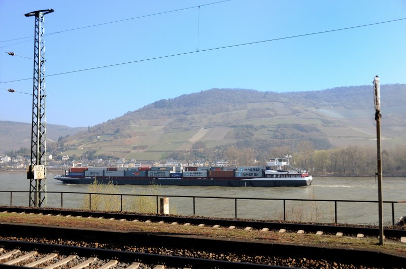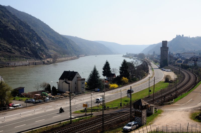 Die wichtigsten Verkehrsträger im mittleren Rheintal: Bahn und Schiff sind eher Freunde statt Kontrahenten... LKWs sind auf den engen Strassen undenkbar. (April 2009, kurz vor Trechtingshausen).