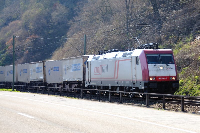 Genau gegenüber der Anlegestelle der Autofähre Kaub liegt der Streckenblock Langscheid mit Schranke. 185 591-5 "Crossrail" grüßt den Rhein mit einem langen Pfiff... oder doch den Fotografen? (April 2009).