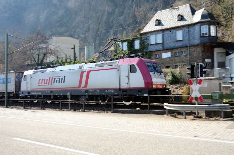 Genau gegenüber der Anlegestelle der Autofähre Kaub liegt der Streckenblock Langscheid mit Schranke. 185 591-5  Crossrail  grüßt den Rhein mit einem langen Pfiff... oder doch den Fotografen? (April 2009).