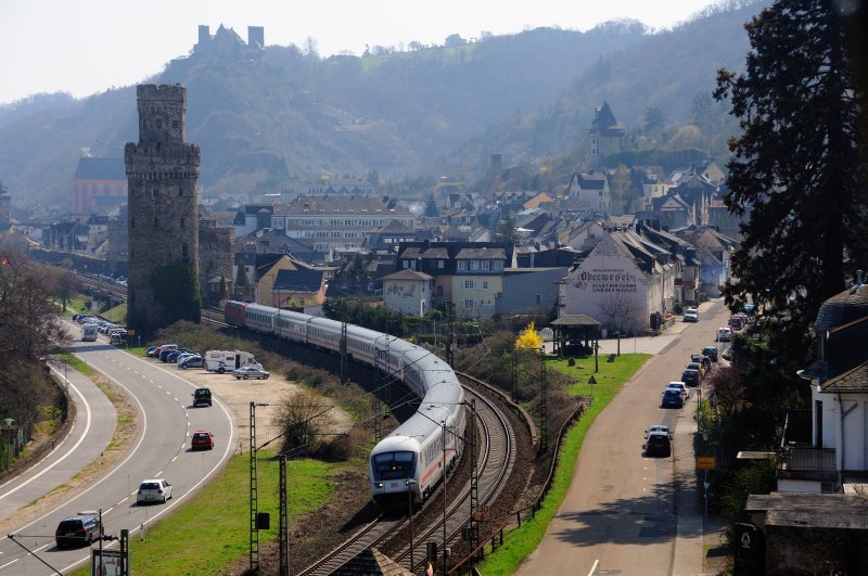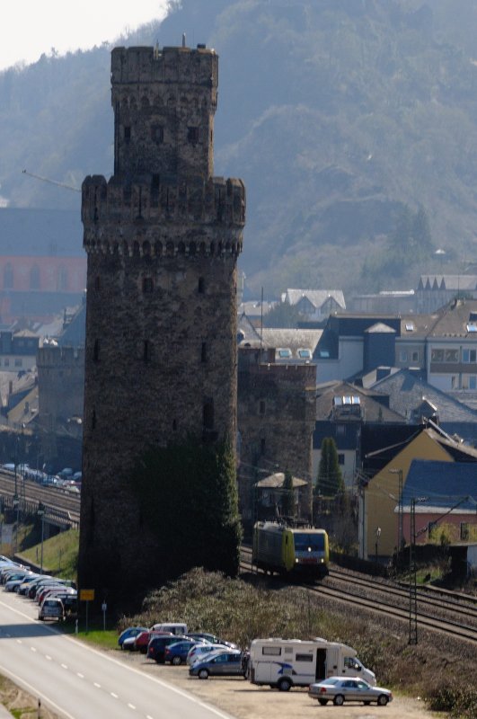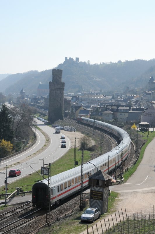 Historische Stätten zieren die KBS 471 allerortens am Rhein. In Oberwesel passiert ein IC erstmal einen hölzernen Wachturm... dann einen Fried der ehemaligen Stadtbefestigung Oberwesel, direkt an der Strecke, um dann Burg Schönburg zu unterfahren. (April 2009).