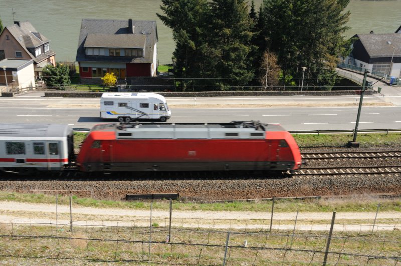 Verfolgungsfahrt ohne Chance... für das Wohnmobil. 101 106-3 zieht mit deutlich mehr Tempo durch Oberwesel am Rhein. Mitzieher mit Fokus auf den Camper. (April 2009).