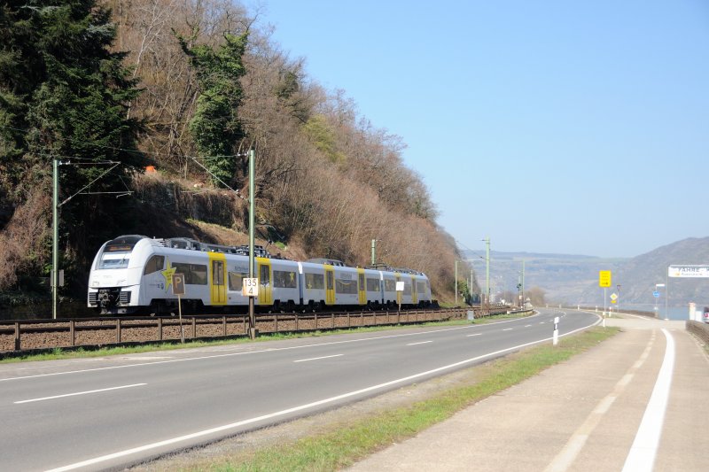 Zwischen Bacharach und Oberwesel hat die Autofähre Kaub ihre Anlegestelle, um die Rheinseite zu wechseln. Und wieder grüßt ein Rhein-Stern, hier 460 007-1, die Fotografen. (April 2009).