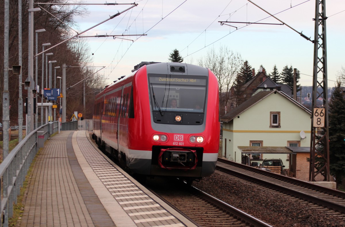 Ein 612er Doppel hat die höchste Stelle der Strecke im Vogtland erreicht und hat das Endziel Dresden, der nächste planmäßige Halt von RE 3791 wird in Plauen oberer Bahnhof sein.