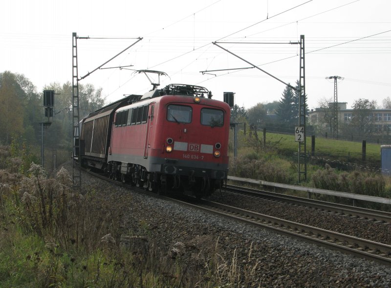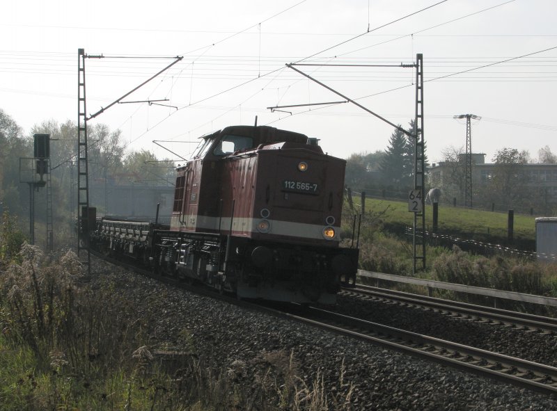 BR 112 565-7 der Pressnitztalbahn GmbH kurz vor Crimmitschau aus Richtung Werdau mit Flachwagenzug. Aufnahmezeitpunkt: 25.10.2008 13:15 Uhr. War ne schöne Überraschung! Helko Böhme