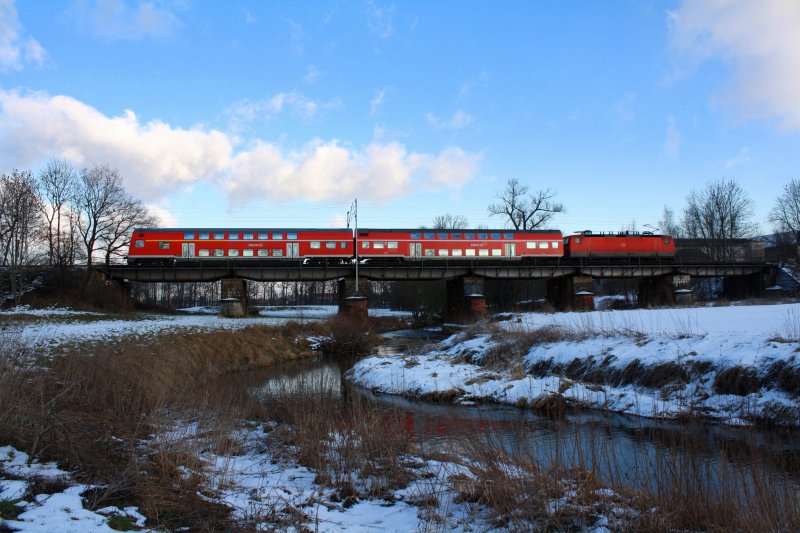 2 Triebzüge der Baureihe 612 bilden am 12.04.09 den RE 3627 von Erfurt nach Altenburg, hier kurz vor dem Ziel bei der Überfahrt über die Pleiße zwischen Kotteritz und Münsa. Björn G. Dietrich