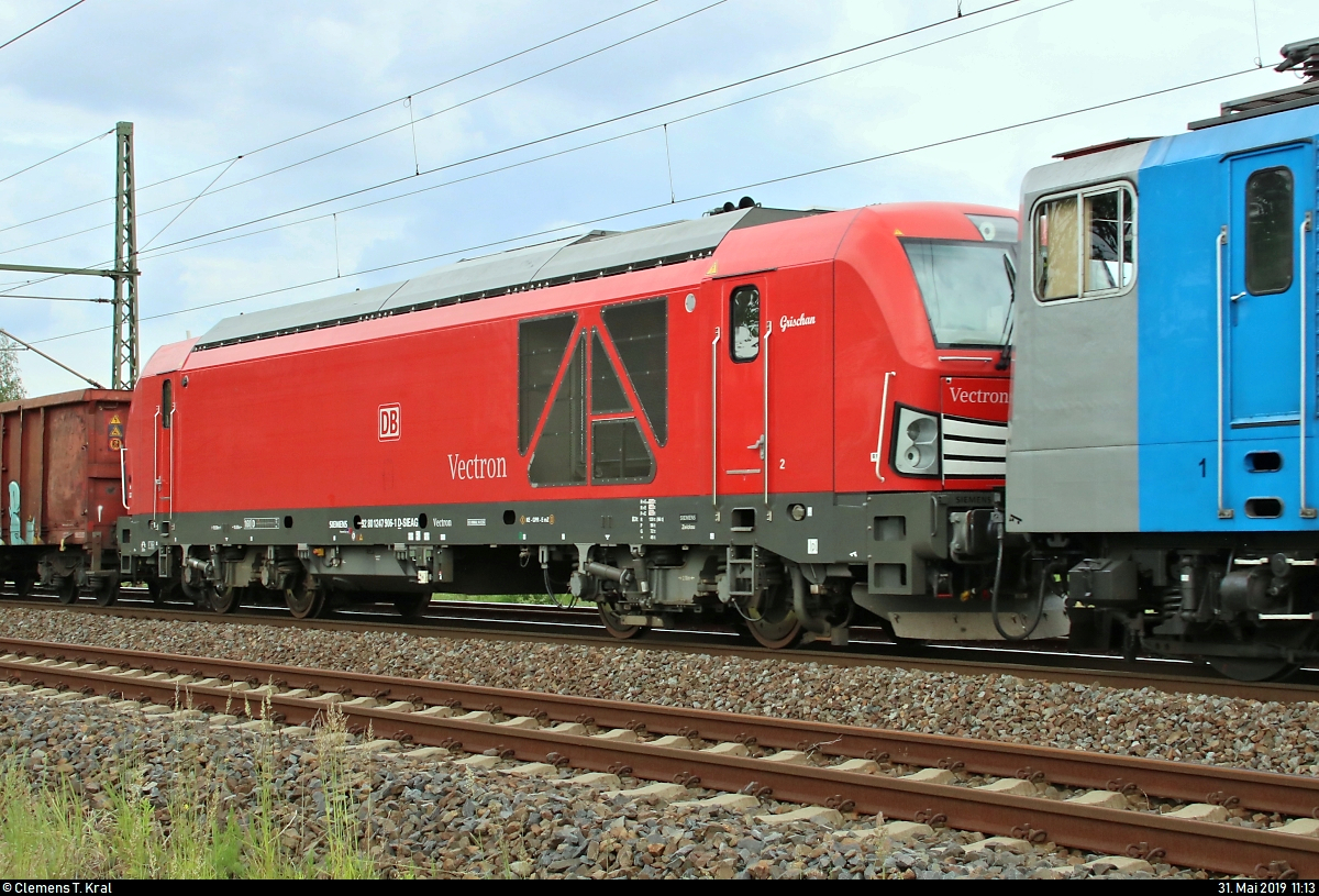 Gemischter Gz von Halle(Saale)Gbf nach Zwickau(Sachs)Hbf mit 193 360-5 "I am European" (Siemens Vectron) DB sowie überführter 155 138-1 Railpool, vermietet an die DB, und 247 906-1 "Grischan" (Siemens Vectron) DB fährt in Halle-Kanena/Bruckdorf auf der Bahnstrecke Magdeburg–Leipzig (KBS 340).