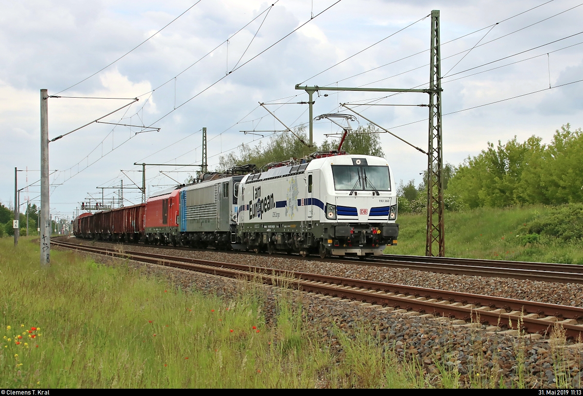 Weil sie zum Aufnahmezeitpunkt erst neu beklebt war, hier noch ein Blick auf 193 360-5 "I am European" (Siemens Vectron) DB, die einen gemischten Gz von Halle(Saale)Gbf nach Zwickau(Sachs)Hbf in Halle-Kanena/Bruckdorf auf der Bahnstrecke Magdeburg–Leipzig (KBS 340) zieht und zeitgleich 155 138-1 Railpool, vermietet an die DB, sowie 247 906-1 "Grischan" (Siemens Vectron) DB überführt.