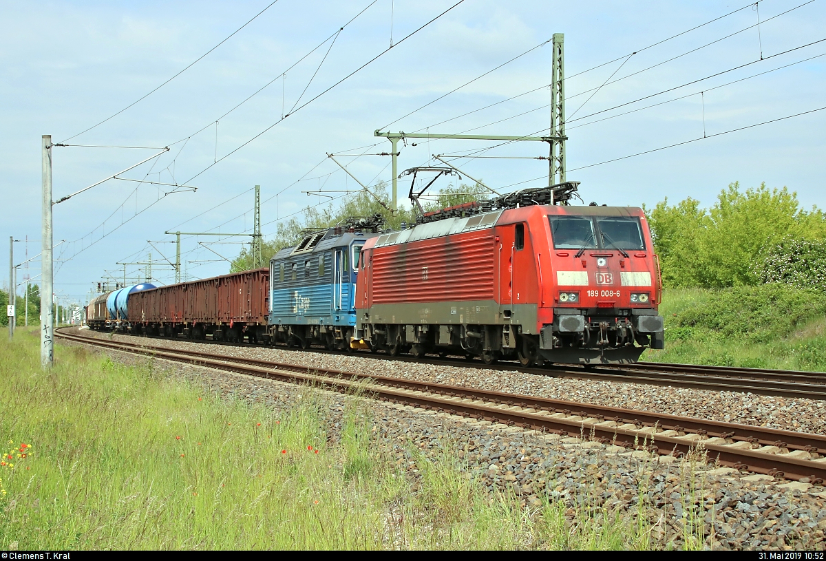 Gemischter Gz mit 189 008-6 DB und 372 008-3 der ČD Cargo, a.s. (kalt) fährt in Halle-Kanena/Bruckdorf auf der Bahnstrecke Magdeburg–Leipzig (KBS 340) Richtung Leipzig.