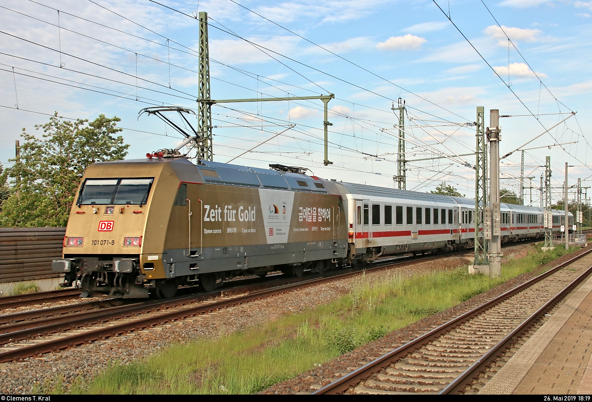 Bimdzf mit Schublok 101 071-9 "Zeit für Gold | 금을위한 시간 | 金の時間" als verspäteter IC 2239 "Warnow" (Linie 56) von Warnemünde nach Leipzig Hbf passiert den Hp Halle Messe auf der Bahnstrecke Magdeburg–Leipzig (KBS 340).