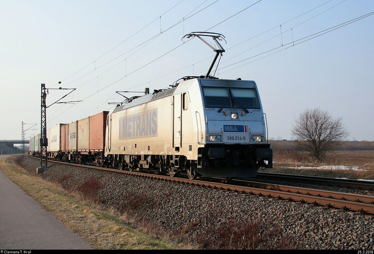 386 014-5 Metrans als Containerzug fährt in Schkeuditz West auf der Bahnstrecke Magdeburg–Leipzig (KBS 340) Richtung Leipzig. [25.3.2018 | 17:44 Uhr] Clemens Kral