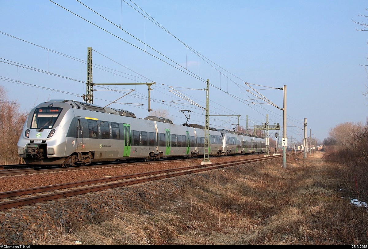 1442 210 und 1442 109 (Bombardier Talent 2) der S-Bahn Mitteldeutschland (DB Regio Südost) als S 37527 (S5X) von Halle(Saale)Hbf Zwickau(Sachs)Hbf fahren in Halle-Kanena auf der Bahnstrecke Magdeburg–Leipzig (KBS 340). [25.3.2018 | 17:18 Uhr] Clemens Kral