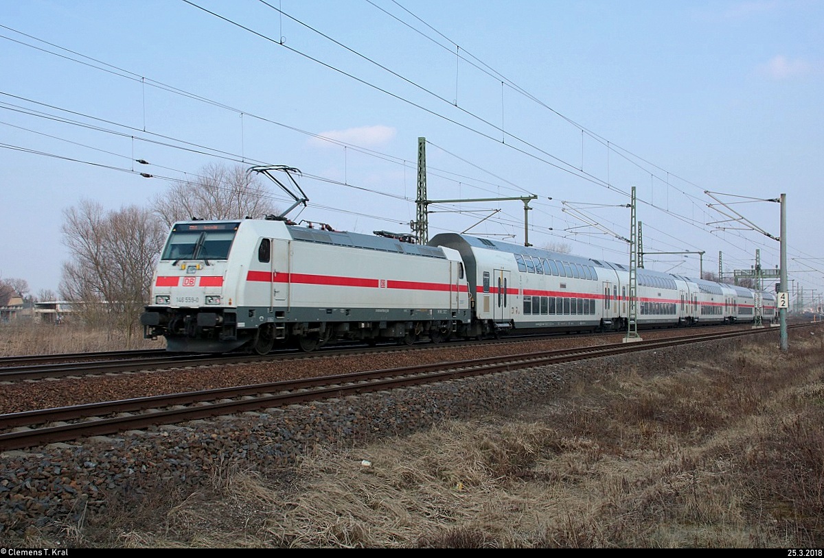 Nachschuss auf 145 559-0 DB als IC 2049 (Linie 55) von Köln Hbf nach Dresden Hbf, der in Halle-Kanena auf der Bahnstrecke Magdeburg–Leipzig (KBS 340) fährt. [25.3.2018 | 16:59 Uhr] Clemens Kral