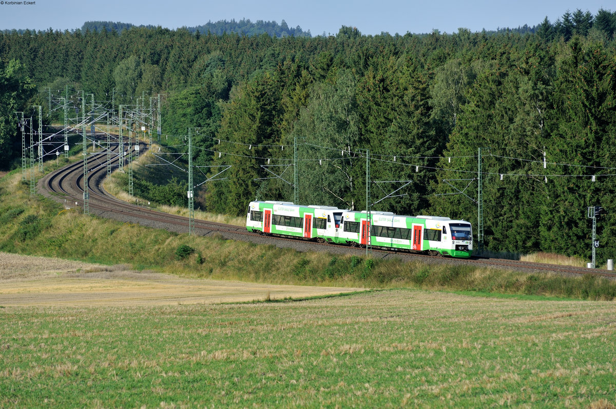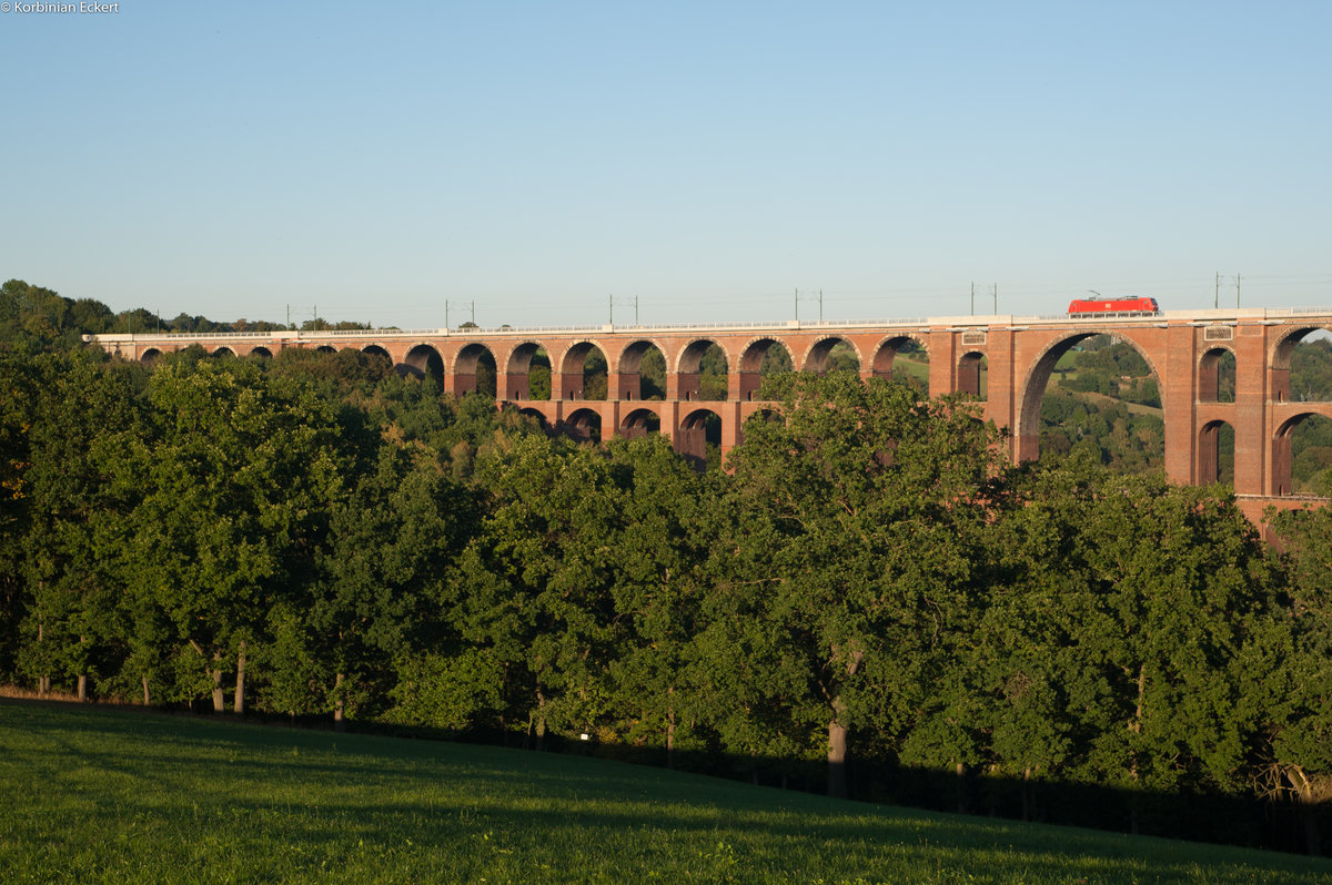 Der eigentlich verkehrende EZ 51619 kam nur als Lz daher. Die Lok übernahm in Hof dann den EZ 51716, der aus Nürnberg mit einer 232/233 kam. Auf der Göltzschtalbrücke wurde die einzelne 185 abgewartet, 25.08.2016 Korbinian Eckert