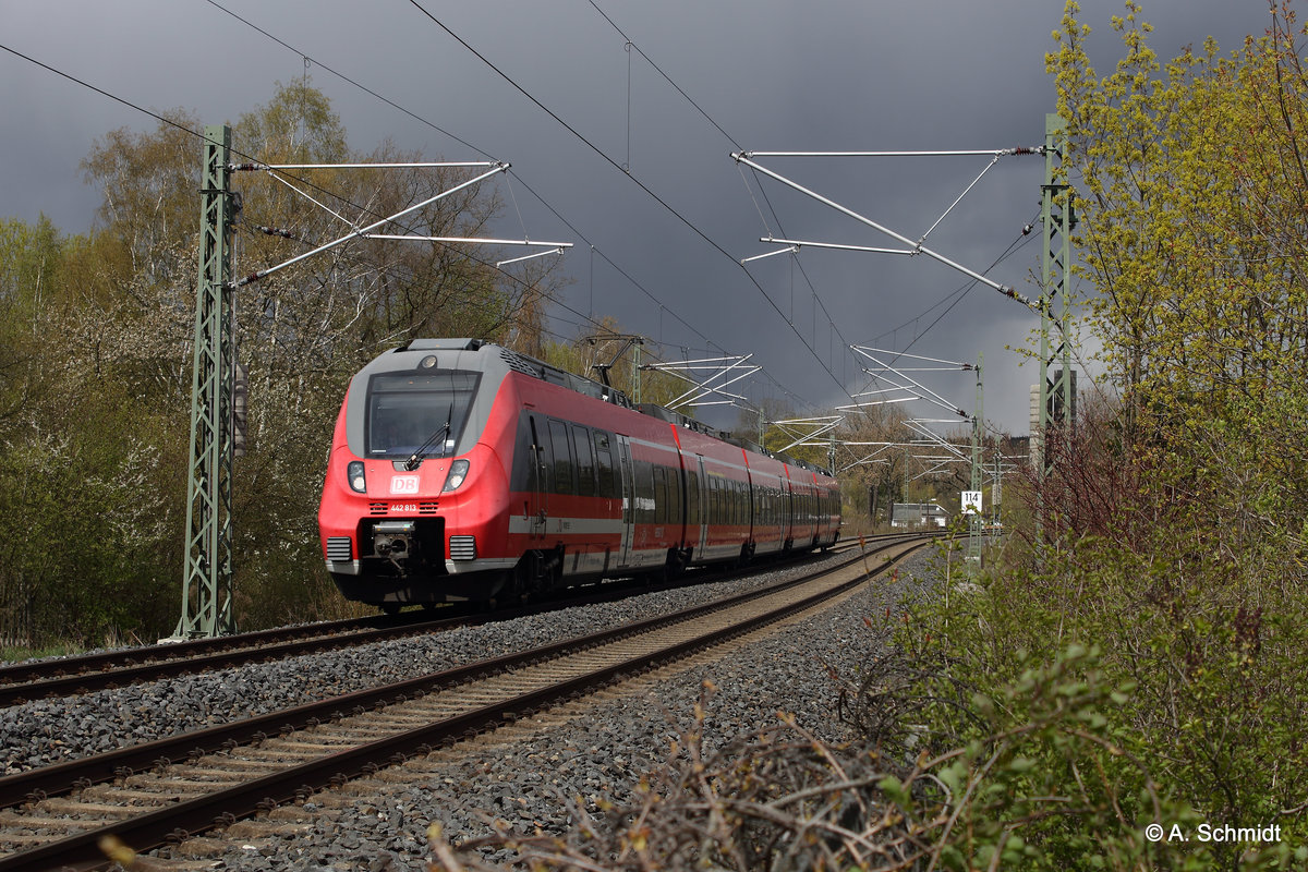 Ersatzzug bei RE3 von Dresden nach Hof mit dem "Hamster" 442, hier vor einem Schneeschauer im Sonnenlicht am 24.04.2016 aufgenommen bei Einfahrt in Plauen. Andreas Schreiber